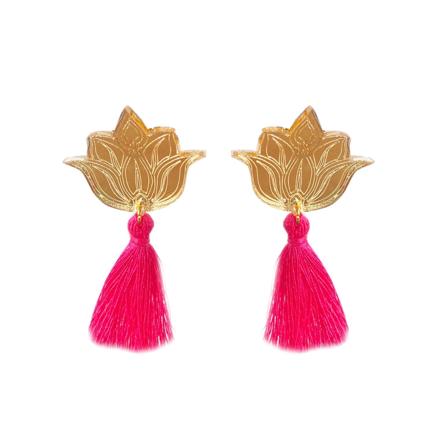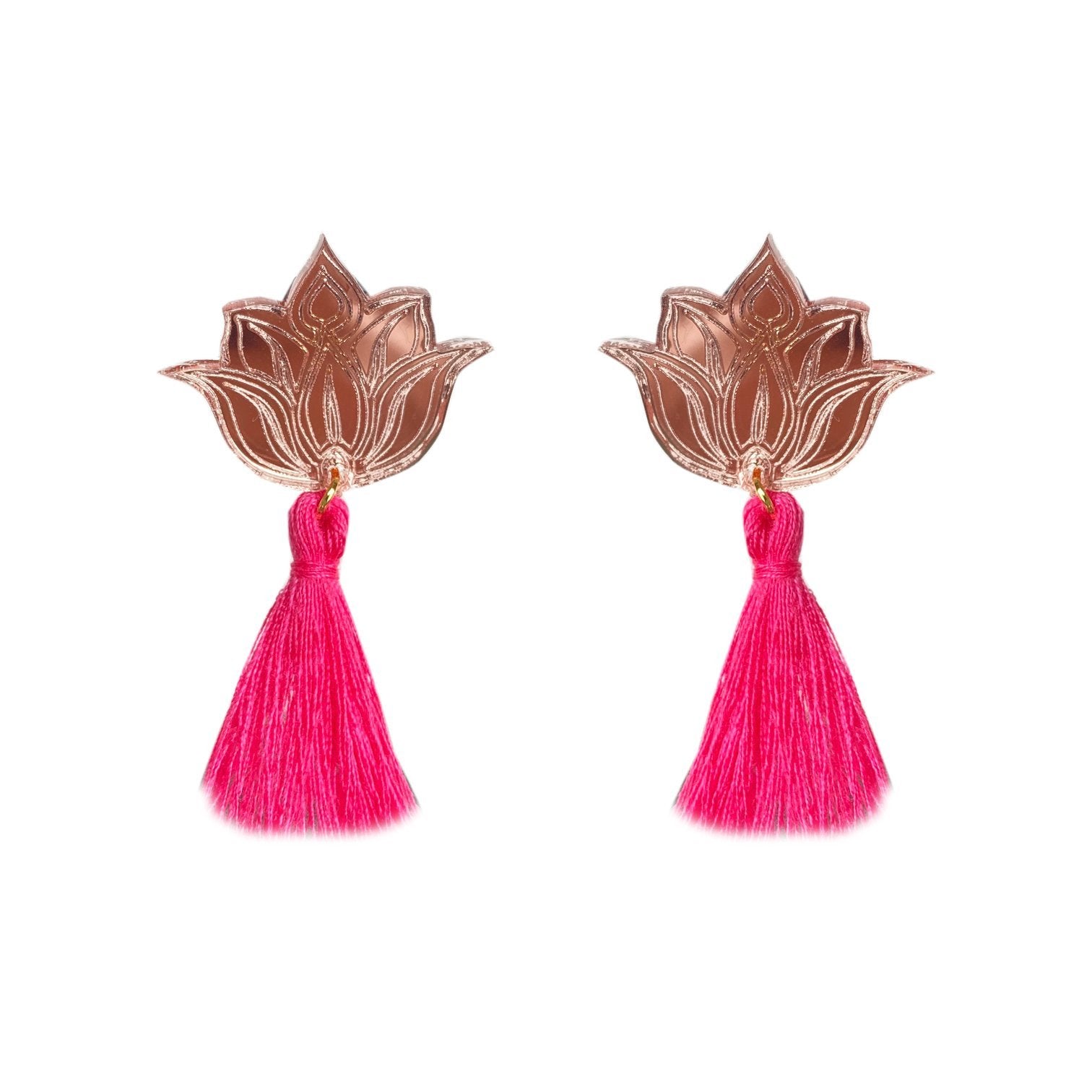 Our Lotus earrings are intricately etched from beautifully mirror acrylic with a pink cotton tassel.